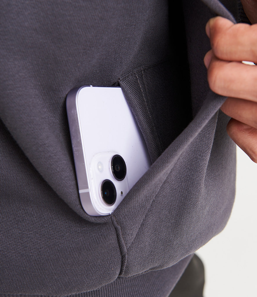 Brushed back fleece. Drop shoulder style. Oversized fit. Three panel double fabric hood. Front pouch pocket with inner media pocket. Ribbed cuffs and hem. Twin needle stitching. Tear out label.