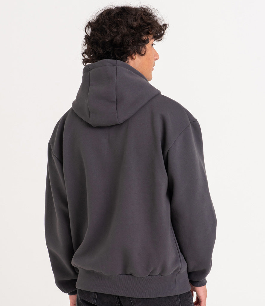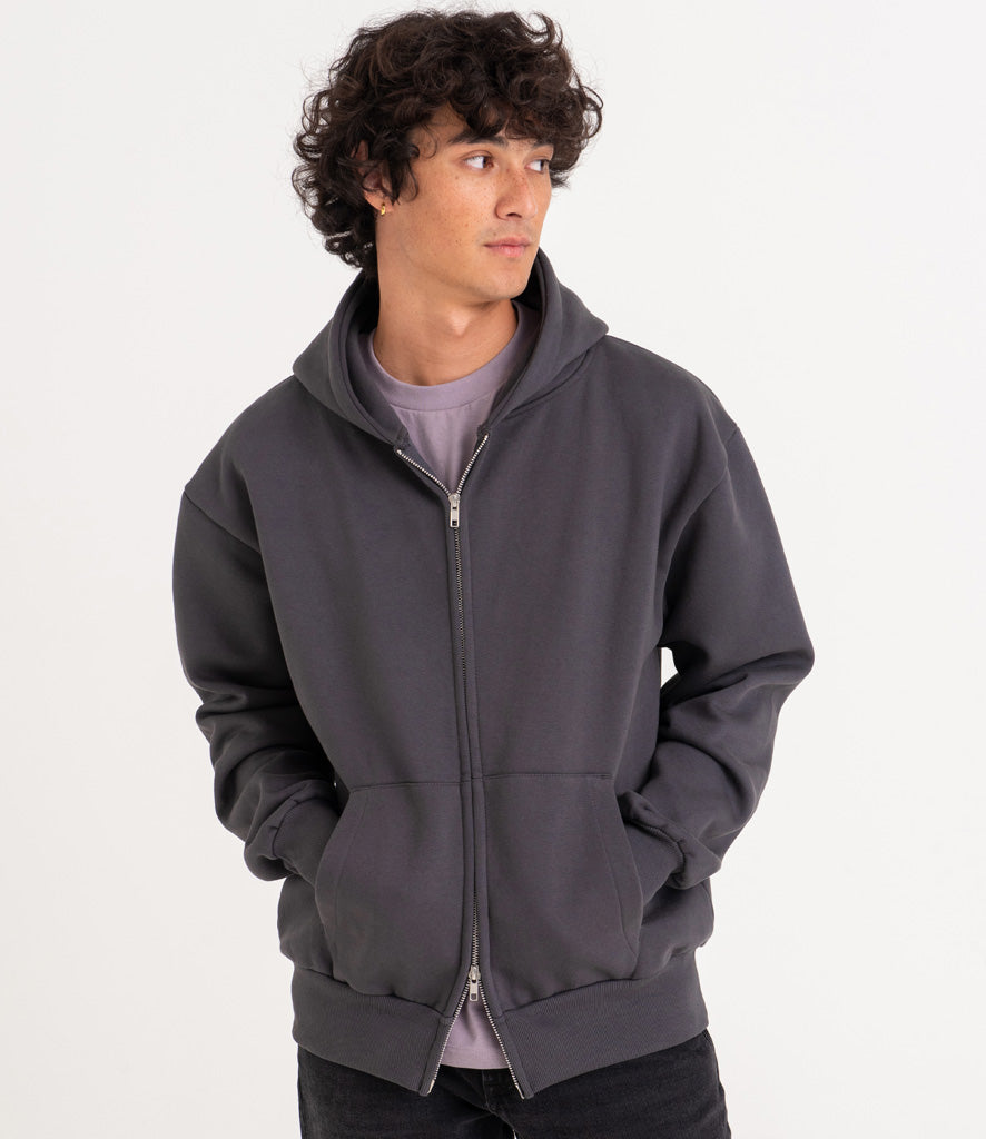 Features Cotton faced fabric. Brushed back fleece. Drop shoulder style. Oversized fit. Three panel double fabric hood. Full length two way zip. Front pouch pockets. Ribbed cuffs and hem. Twin needle stitching. Tear out label.