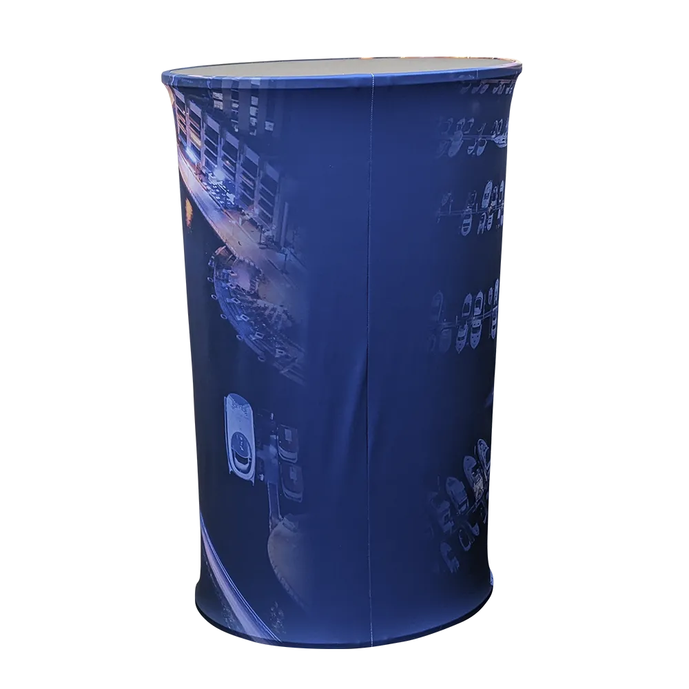 The Stretch Fabric Oval Counter consists of three strong, lightweight, tubular aluminium poles, counter-top and base, and a printed fabric cover.