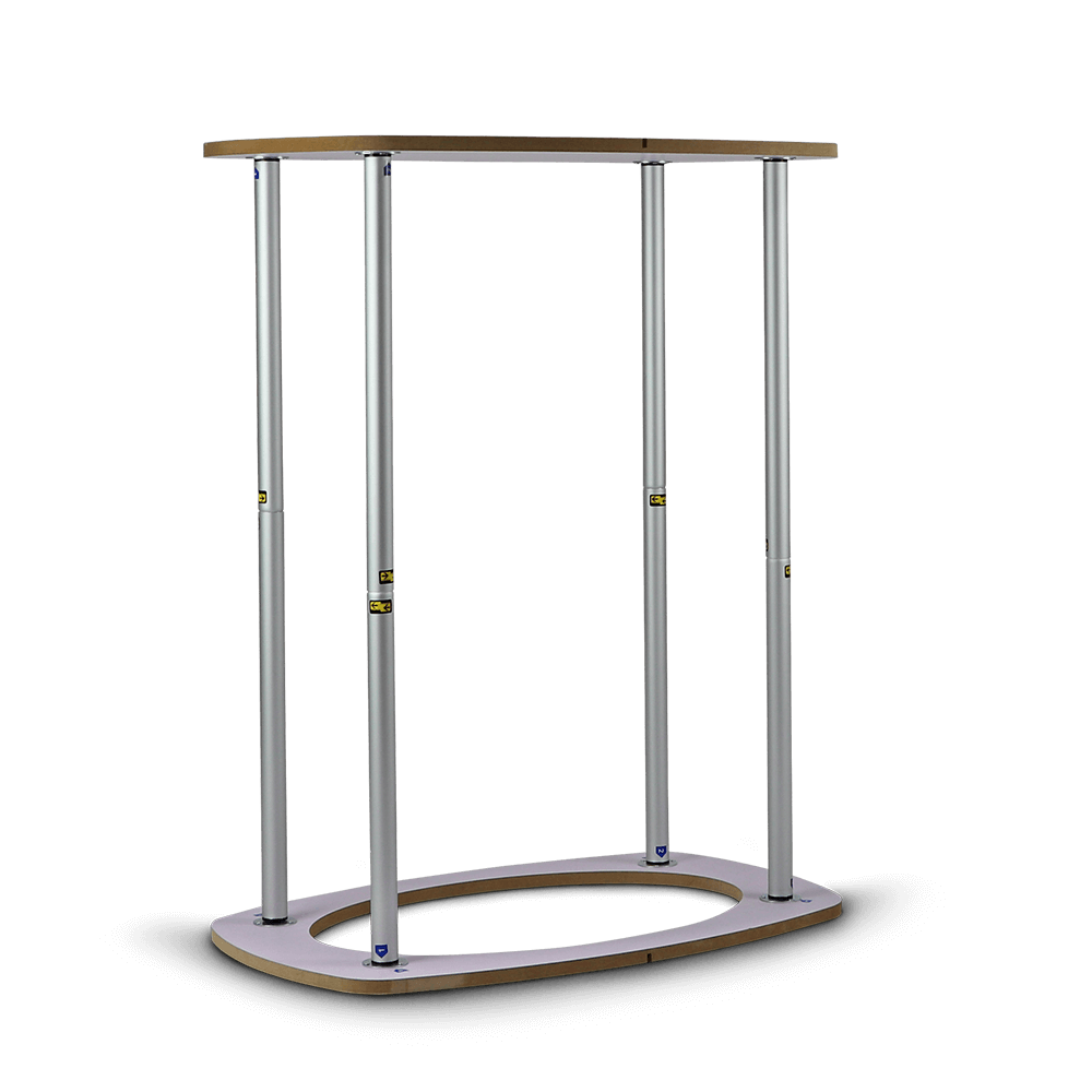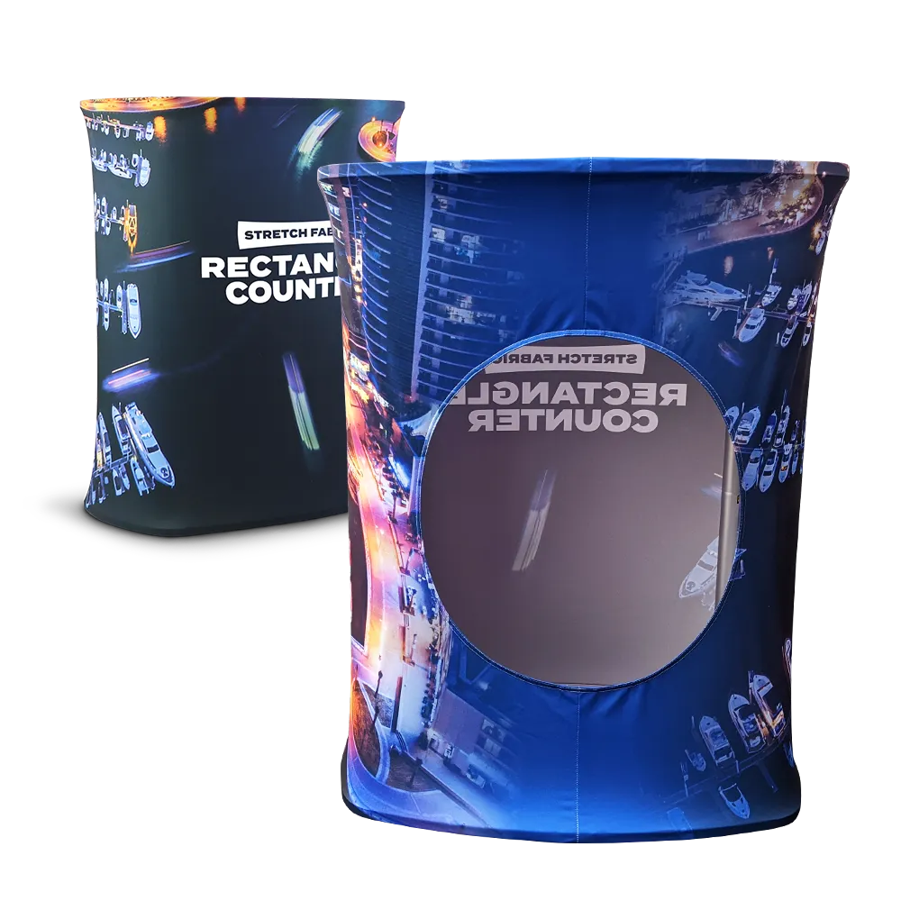 The Stretch Fabric Rectangle Counter consists of four strong, lightweight, tubular aluminium poles, counter-top and base, and a printed fabric cover.